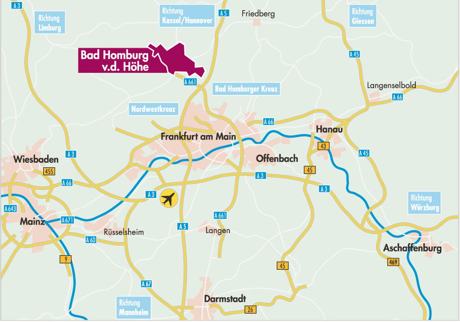 - A3 from Würzburg: exit Offenbacher Kreuz to A661 Bad Homburg, exit "Bad Homburg Stadtmitte".
